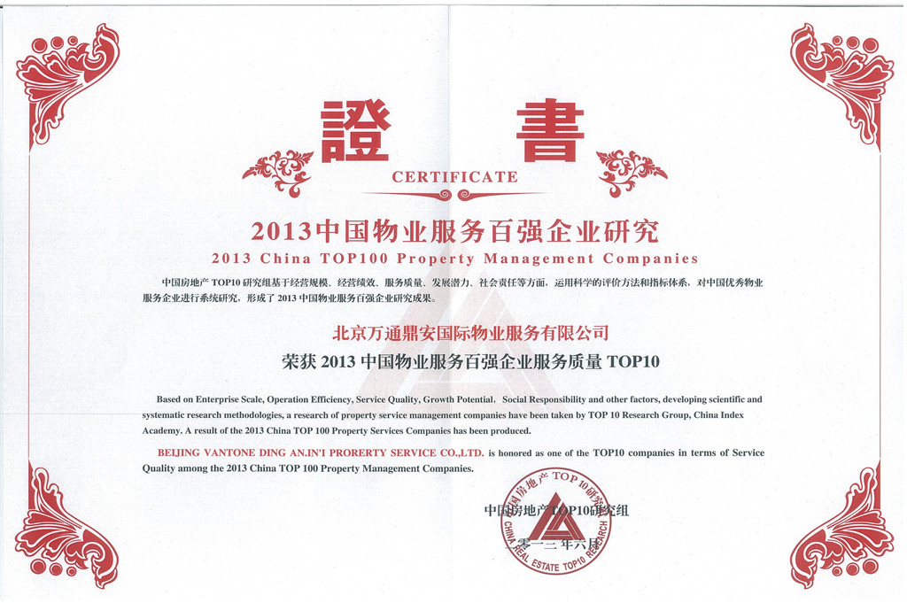 荣获2013中国物业服务百强企业服务质量TOP10