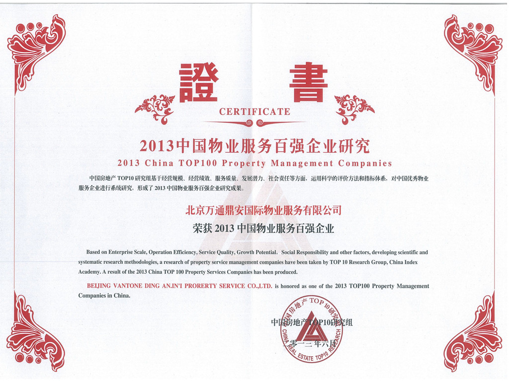 荣获2013中国物业服务百强企业服务质量TOP10