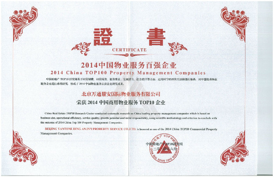 荣获2014中国商用物业服务TOP10企业